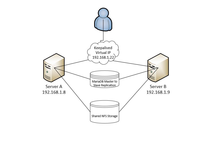 Here is the general layout we use keepalived to make sure the application is accessible in case of a failure keepalived uses VRRP ( Virtual Router Redundancy Protocol) to advertise a virtual IP from either the primary server or the secondary.  Both servers as you see from the diagram have their own IP but on top of that have a virtual IP they will use depending on their state. The user will connect to the virtual IP instead of the server IP so in the case of a failure, the user would not know they have switched servers. We use MariaDB replication to ensure that the databases are the same on both servers.
